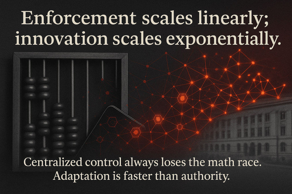 Enforcement scales linearly; innovation scales exponentially.